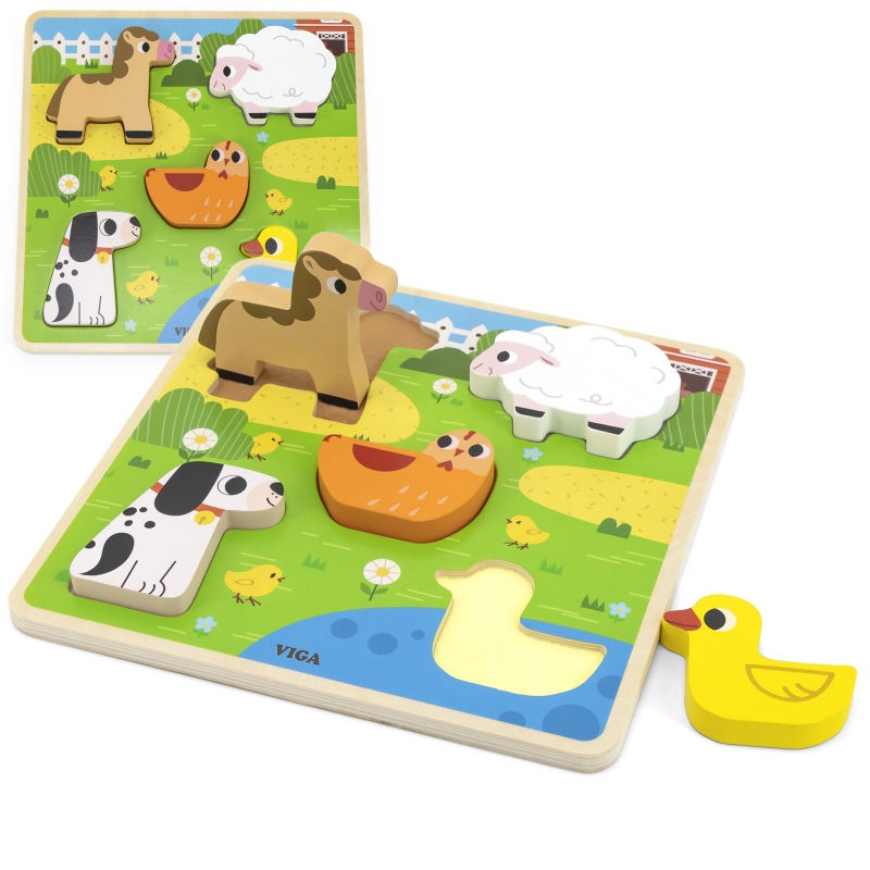 Klasyczne Drewniane Puzzle od marki VIGA w motywie farmy. W zestawie znajduje się kolorowa plansza oraz 5 elementów ze zwierzątkami. Zabawa polega na dopasowaniu kafelków zwierząt do odpowiednich miejsc na kolorowej podstawce. Taka zabawa pomoże kształtować precyzję ruchów rączek, oraz poprawić koordynację wzrokowo-ruchową, a także ćwiczyć pamięć, logiczne myślenie i koncentrację.