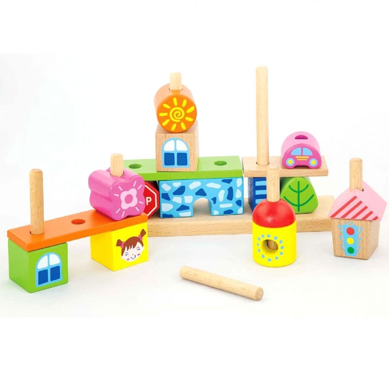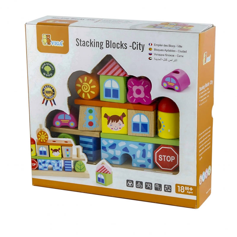 Drewniane, konstrukcyjne klocki od firmy Viga, sprawią mnóstwo radości i zajmą dziecko zabawą na wiele godzin. Zestaw zawiera 26 elementów – 14 różnokolorowych klocków, 8 kołeczków oraz 4 deseczki (podkładki i podstawa), z których można konstruować swoje własne, urocze miasteczko! Zabawa pobudzi w dziecku kreatywność i sprawi, że będzie mogło wymyślać nowe historie i kreować przygody wymyślonych bohaterów!