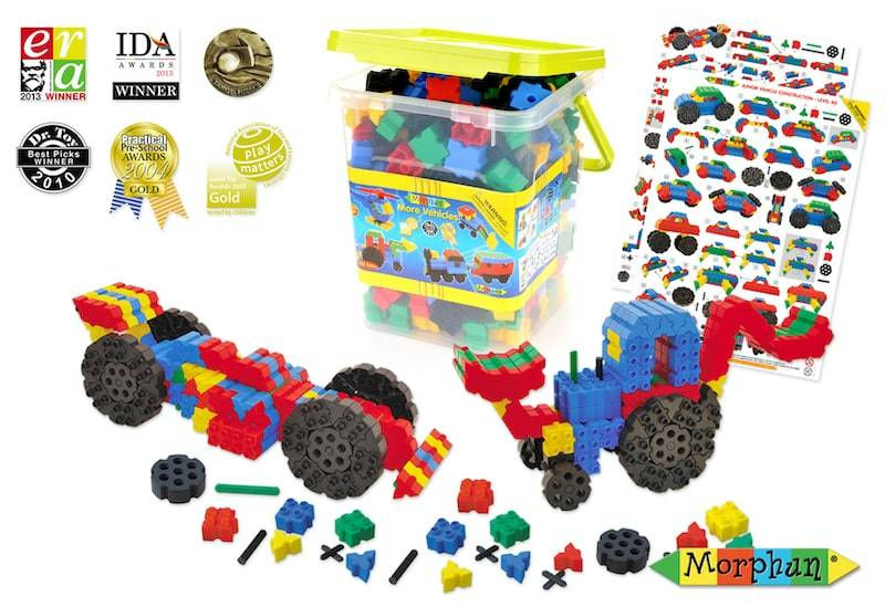 Klocki wchodzące w skład tego zestawu z serii Morphun to gwarancja świetnej zabawy przez długie godziny. Tym, co wyróżnia ten komplet klocków konstrukcyjnych na tle standardowych klocków, jest o wiele większa paleta możliwych do wybudowania modeli. Klocki bardzo łatwo się łączą w różnych płaszczyznach a ruchome koła pozwalają na budowanie mobilnych modeli. Wszystkie klocki wykonane są z bardzo trwałego plastiku, dobrze się ze sobą łączą nawet w wielowymiarowe konstrukcje. Kolorowe instrukcje przedstawiające kolejne etapy budowy poszczególnych pojazdów pozwalają na szybsze zapoznanie się z tak wieloma możliwościami budowy.