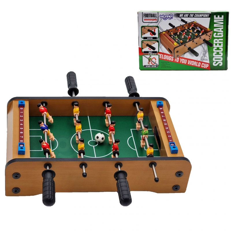 Stół do gry w piłkarzyki firmy Woopie sprawi że Twój maluch będzie miał zajęcie na długie godziny. Gra przeznaczona dla dwóch osób. Na każdej prowadnicy mamy ustawionych po 3 piłkarzy którzy dzielnie grają na boisku. Całość zapakowana w bardzo ładne i schludne opakowanie. Wygodny uchwyt-rączka pozwala na wygodne przenoszenie pudełka z jego zawartością. Całość przeznaczona dla dzieci od lat 6.