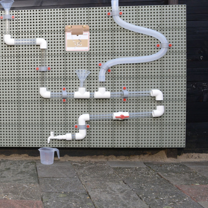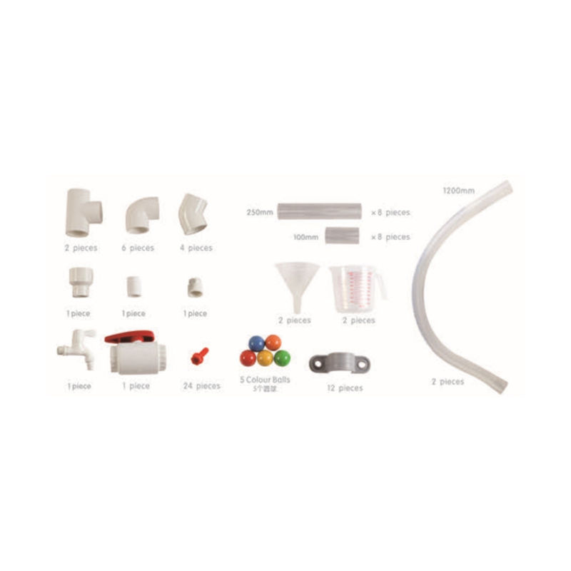 Do zestawu można dokupić pompę wodną, która sprawi, że zabawa stanie się jeszcze ciekawsza. Rurami można przepuszczać wodę, wlewając ją do lejków za pomocą dołączonych do zestawu dzbanków, ale można również zobaczyć jak spadają drewniane piłeczki, wrzucając do środka. Można zbudować jeden ogromny system rur, lub kilka mniejszych, by bawić mogło się kilkoro dzieci jednocześnie. Niesamowita zabawka marki Masterkidz, która służy do skonstruowania hydraulicznego systemu.